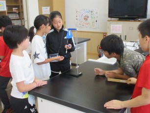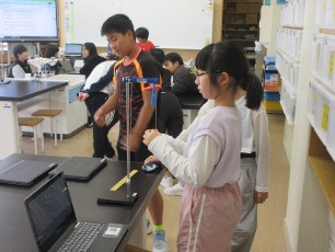 5年生の理科はふりこの学習をしています。ふりこの糸の長さやおもりのおもさを変えた時のふりこの様子を実験を通して学んでいました。学習に主体的に取り組む姿が素敵でした。