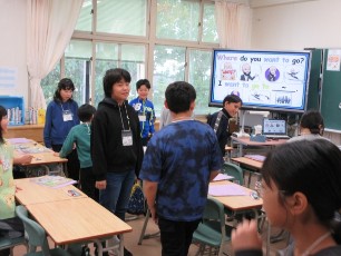 ALTのシーザー先生の授業は、子どもたちが大変意欲的に参加します。子どもたちの思考の流れを考えた教材を用意し、活動などを的確に位置付けているからです。今日も、色々なまちの特徴を踏まえながら、行きたいまちについて交流をしていました。