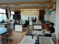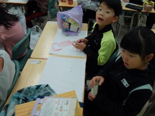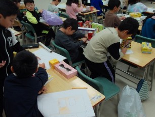 1年算数科では、ご家庭からたくさんの箱をもってきて、どんな形からできているのか学んでいました。その形を利用して、電車や動物など、連想しながら絵を完成していました。このような活動から、図形のとらえ方を身に付けていました。