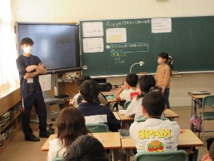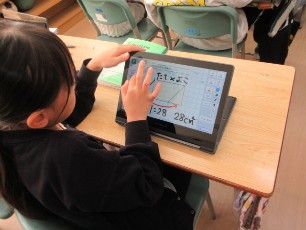 5年生の算数は、平行四辺形の面積を求めました。面積を求めるための公式がわかっている長方形や正方形に変形させて、求めていました。画用紙の平行四辺形を切ったり、タブレット上で操作したりして、理解を深めていました。