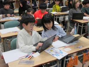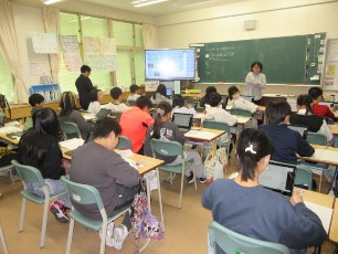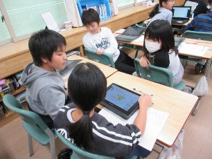 5年生は、三角形の面積の求め方について考えました。面積を求めることができる正方形や長方形、平行四辺形に変形させて、面積を求めました。タブレットを活用したり、実際に図形を切ったりはったりしながら、考えていました。