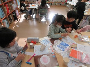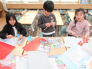 2年生の生活科では、紙コップやふくろ、キャップなどを使って、おもちゃづくりをしていました。楽しく遊んだり、動いたりするにはどうしたらよいのか、自分で試したり、友だちと相談したりして進めていました。