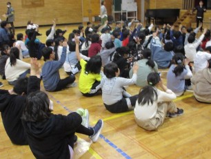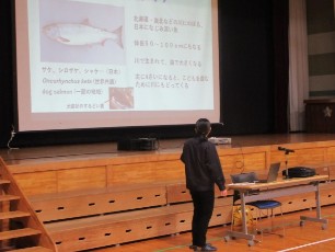 4年生は、春に放流したサケが海でどのように成長するのか、なぜ、再び川に戻ってくることができるのか等、サケの生態について学びました。冬にはサケの卵を育てる活動もあります。子どもたちは興味深げにお話を聴いていました。