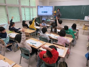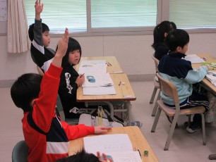 1年生の国語では、「たぬきの糸車」という、ちょっと昔という場面設定のお話を勉強していました。そのため、ちょっと難しい言葉も出てきます。今日は、言葉の意味をみんなで確認していました。自分の知っている言葉を使いながら一生懸命説明する1年生の姿が素晴らしかったです。