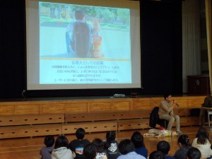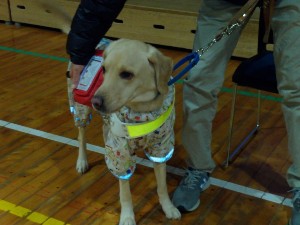 今日は、実際に盲導犬と一緒に行動している視覚障害の方と、NPO法人プリズムさっぽろの方を招いて、盲導犬の訓練の様子や仕事について学びました。質問にも丁寧に答えていただき、たくさんのことを知ることができました。講座の間、静かに寝て待っていた盲導犬の様子からも、しっかりとした訓練とユーザーさんとの信頼関係を感じました。
