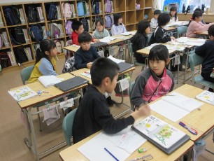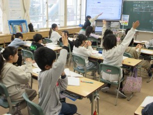 3年生は、分数の学習をしています。1をいくつに等しく分けるかによって、分母が決まりますが、なかなか理解が難しい内容です。子どもたちは、色々な考えをもち、どれが正しいのか考えていました。このような経験が確かな理解へと結びつきます。