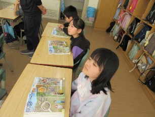 3年生の外国語活動では、子どもたちが楽しく英語を発音していました。シルエットの画像から、それが何かを予想し、英語で答えていました。ゲーム性もある授業だったので、楽しく学習を進めていました。