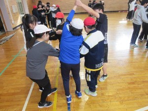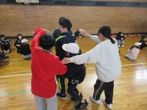 ほかの学年の人たちと仲良くなろうと、書記局が企画した学年交流会がありました。今日は4年生と6年生で「人間知恵の輪」に挑戦しました。6、7人で1グループを作り、手をつないだままくぐったりして4分間で1つの輪になります。どのグループも互いに声を掛け合いながら、楽しそうに取り組んでいました。あと1ヵ月で卒業してしまう6年生と楽しい思い出ができたようです。