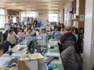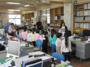 1年生は学校探検に出かけました。今まで入ったことがなかった職員室や校長室、特別教室をまわりながら、自分たちの教室とのちがいを楽しんでいました。また、担任の先生から、職員室等に入るときの礼儀も教えてもらい、とても上手に行っていました。