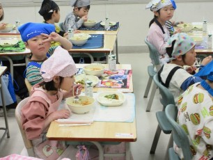 1年生は小学校入学後、2回目の給食です。本日のメニューのメインは味噌ラーメンでした。色々な所で「美味しい」という声が上がっていました。大好評だったようです。