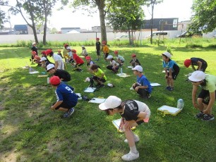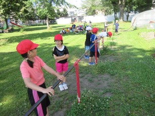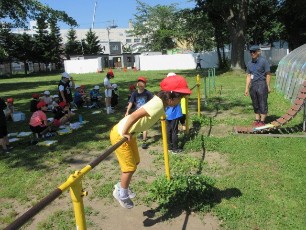 3年生の体育は鉄棒の学習をしていました。様々な技の中から、自分で練習する内容を選び、一生懸命取り組んでいました。暑い日ですが、日かげで休んだり、水分を補充しながら、積極的に取り組んでいました。