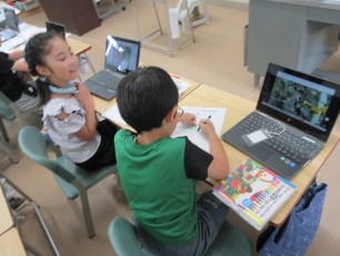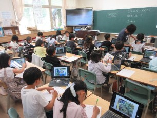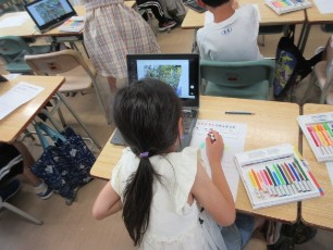 2年生は、ミニトマトを育てています。その成長の様子をタブレットに写真としておさめ、それをじっくり見ながら、観察カードを書いていました。特に強調したいところを大きくしたりしながら、興味に応じて観察していました。