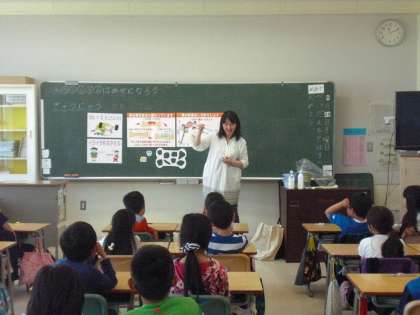 2年生は、5月29日に給食センターの栄養士さんに授業をしていただきました。毎日の給食に出てくる、牛乳にたくさん含まれる、「カルシウム」のはたらきについて教えていただきました。