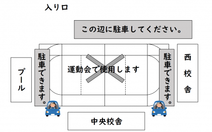 本日、15:30からPTA全体委員会が行われます。グラウンドを下の図のように駐車場として開放しますが、児童が運動会で使用する部分については、車での侵入はしないようにしてください。