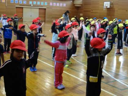 1年生の体育では、ラジオ体操の練習をしています。正しいラジオ体操はかなり動きが難しいようです。本番までには手足をびしっと伸ばした、かっこいいラジオ体操ができるように練習に励んでいきます。