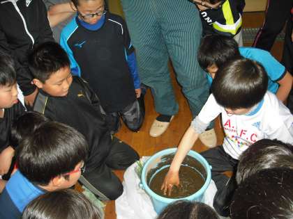 JA道央の方を招いて、5年生の田植え体験が行われました。今年度は、バケツに苗を植える体験でした。実際に田んぼの土を触ったり、苗を触ることで、自分たちが食べているお米がどのように育てられるのかをイメージできたようです。