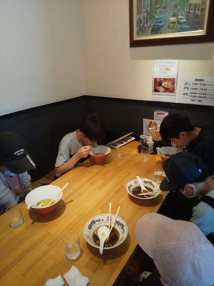 「こっちに曲がったラーメン屋で食べてきました。おいしかった。」という情報を得てラーメン屋に入ると、他のグループがご飯中でした。