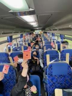 サンパレスに向かう間、バスレクでは「ビンゴ」を楽しんでいます。全員がビンゴになるまで続きます、、、。