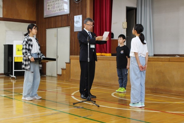 新たに選ばれた児童会長をはじめ、副会長、会計が学校長より認証状を受け、全校の前で決意を述べました。