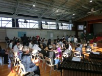 全校朝会をみる4年生