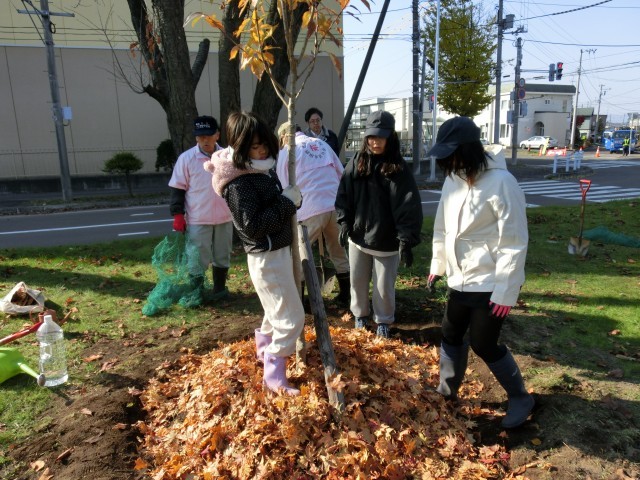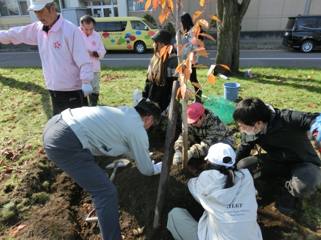 子どもたちは「恵庭一万本桜植樹市民の会」の方々に教えていただきながら、木の苗を丁寧に植えていきました。