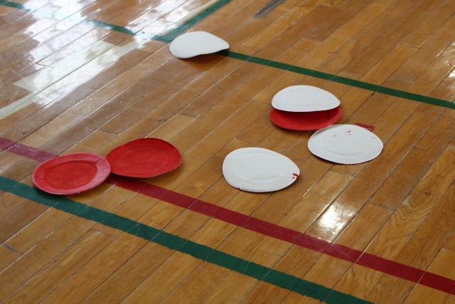 床に置かれた赤と白の丸い紙皿を、制限時間内に自分のチームの色へめくり、その数を競うゲームです。