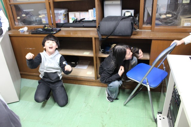 当日は、校内の様々な場所で、工夫を凝らして身を隠す子どもたちの姿が見られました。