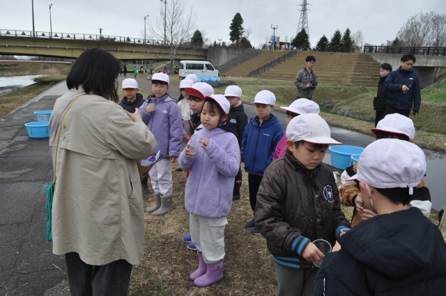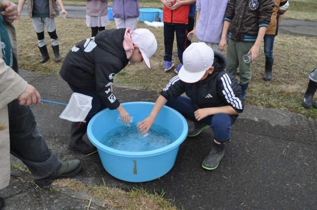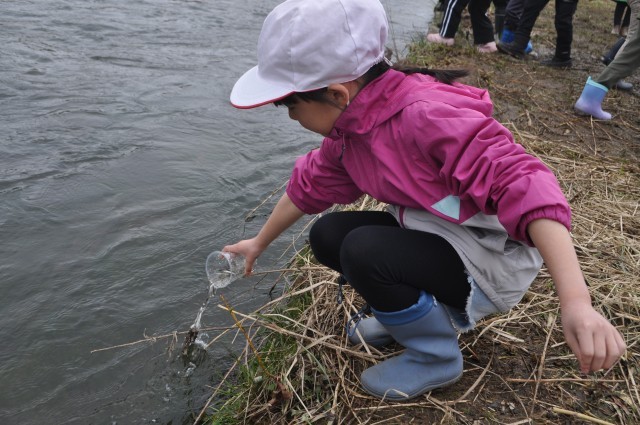 昨日、2・3年生がサケの稚魚の放流を行いました。