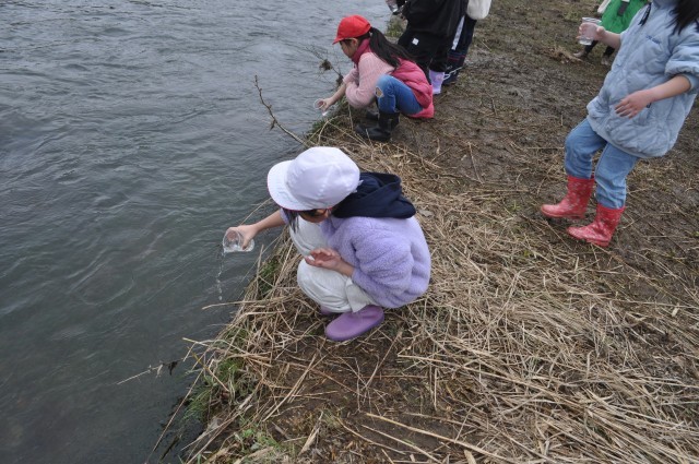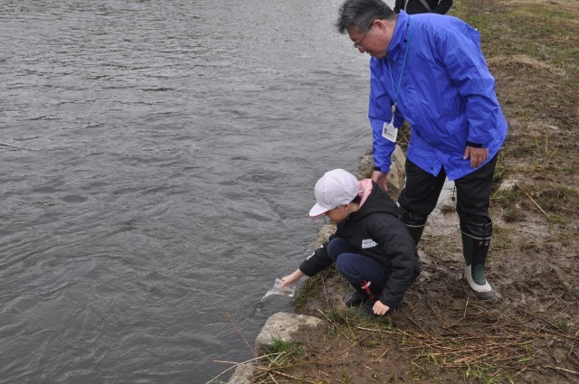 放流は漁川で行い、子どもたちは「大きくなって帰ってきてね」と声をかけながら、そっと川へ送り出していました。