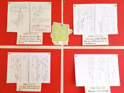 体育館に近い方の音楽室の壁に工夫されている家庭学習ノートを掲示しています。どのノートも努力していることが伝わるノートです。本校では「学びに向かう力」の育成の一つの方法としてノート指導にも力を入れています。全校作品展の観賞など来校の際にご覧ください。