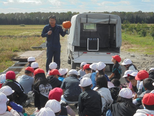 島田さんから、かぼちゃの種類や収穫の仕方について説明を受けました。(1枚目)