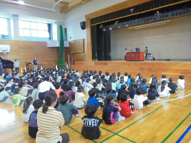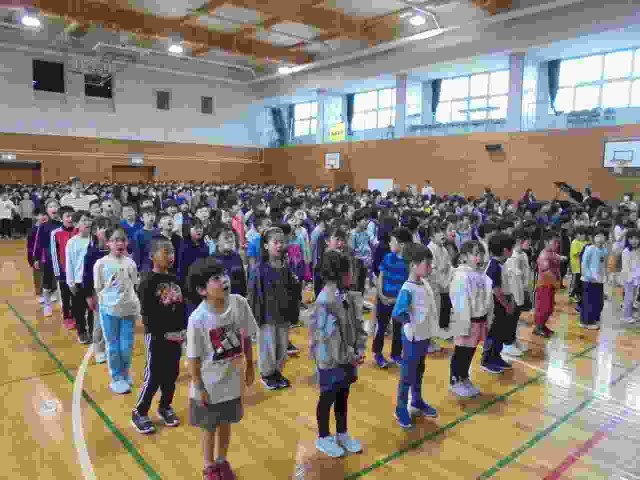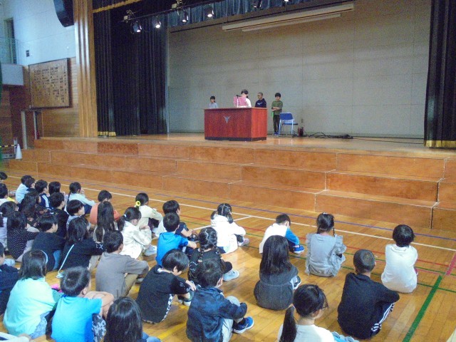 今日は、体育館に全校児童が集まり、前期終業式を行いました。