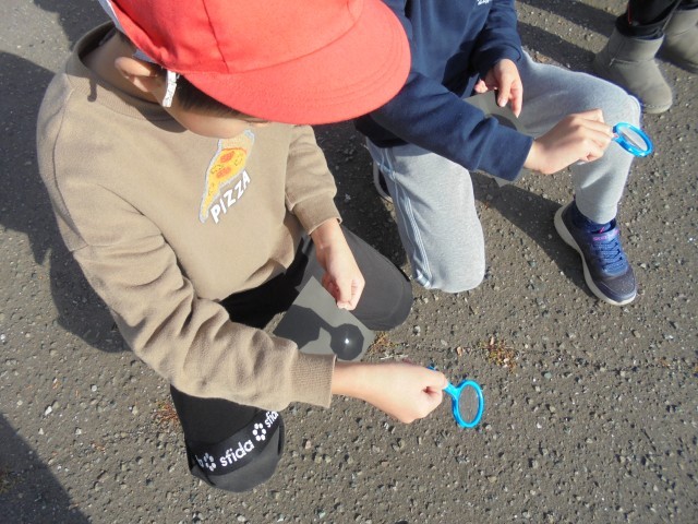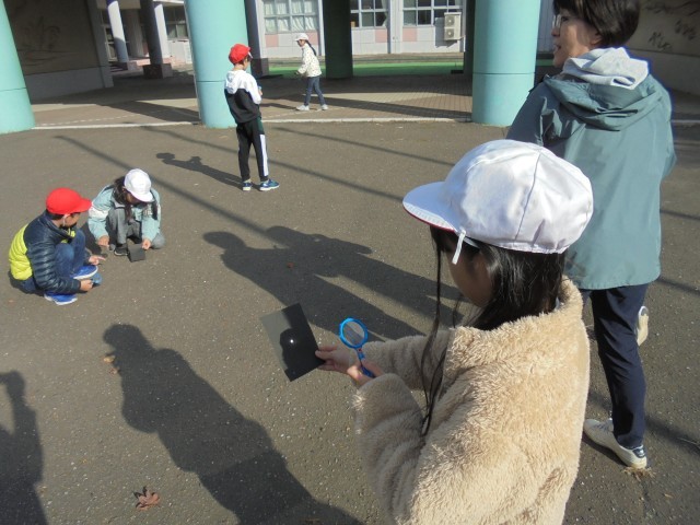 外では、3年生が虫眼鏡と黒い紙をもって理科の実験中。