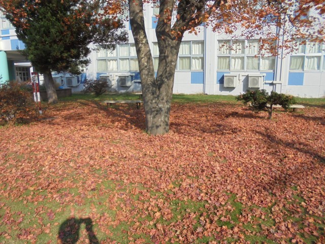 校舎前のカエデの木の下には、オレンジ色の落ち葉の絨毯が広がっています。