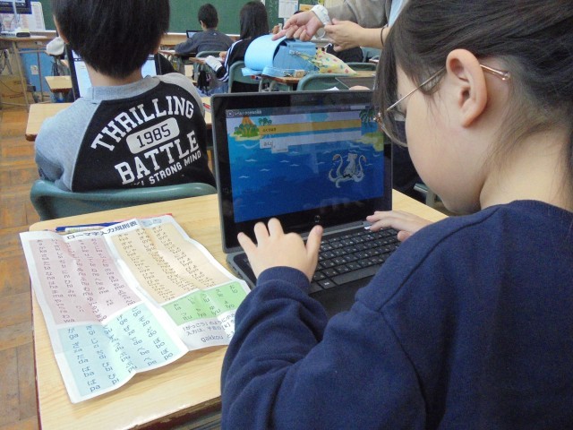慣れない子は、ローマ字表をみながら必死に指を動かしています。