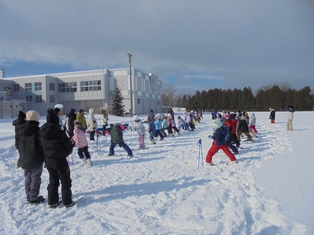晴天の中、たくさんの保護者の皆さんに見守られながら、1回目のスキー学習を行いました。