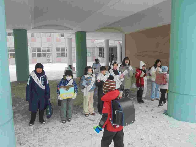 朝、児童会の皆さんが校舎前に立ち、「あいタッチ運動」で