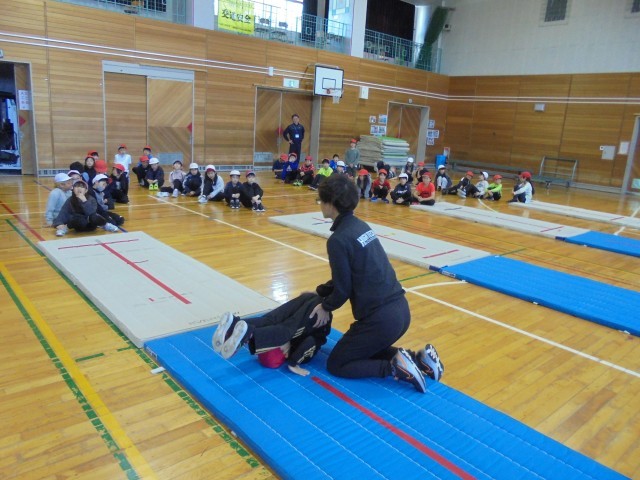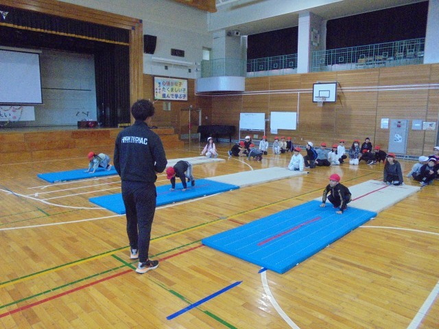 マット運動の「後転」を指導していただきました。