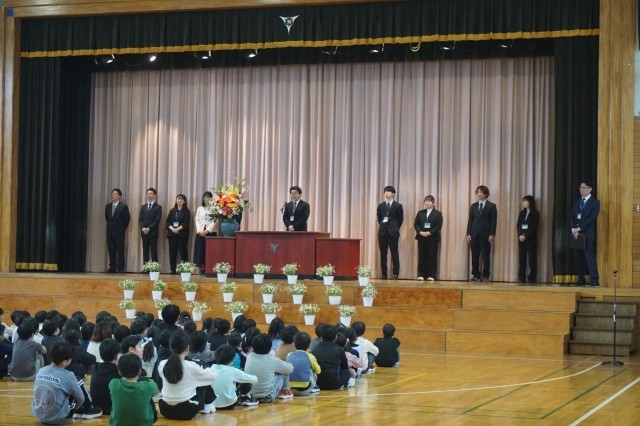 始業式の前に着任式を行い、子どもたちは今年来られた先生方の
