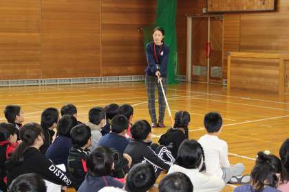 2/08 5年生が総合的な学習の時間に福祉学習の一環で盲導犬講習会を行いました。北海道盲導犬協会から講師の方と盲導犬さんを招いて学習しました。目の不自由な方への接し方や盲導犬の役割など、たくさんのことを学びました。
