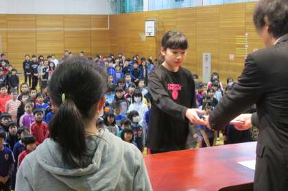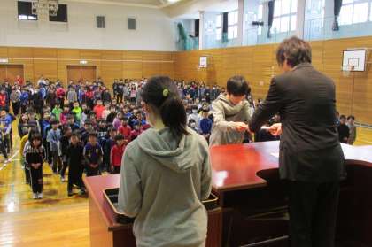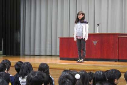 2/17 今朝の児童朝会で、先日の選挙で当選した児童会役員の認証式を行いました。