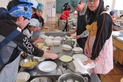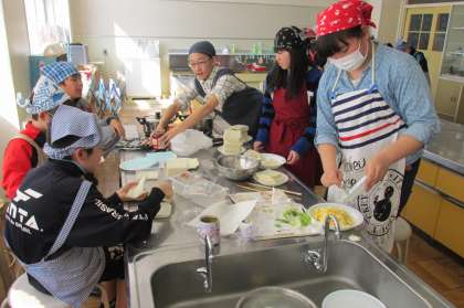3/06 本日、午後より6年生と保護者による卒業を祝う会を行います。その中で、保護者の方にサンドイッチを食べてもらおうと6年生が一生懸命作っていました。