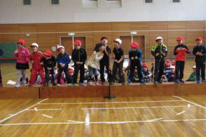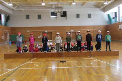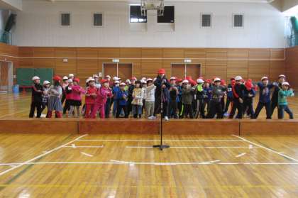 3/07 2年生が体育館で明日の6年生を送る会に向けて発表練習をしていました。スペシャルゲストもいました。