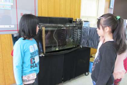 3/13 昼休みのさけ水槽前にもたくさんの児童が見に来ていました。ぐみがなくなった〜、上のほうも泳いでる〜と言いながら見ていました。