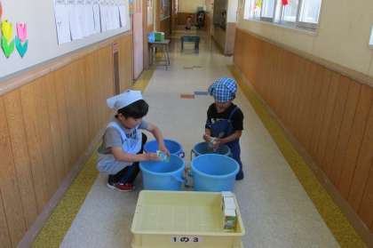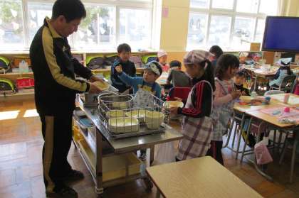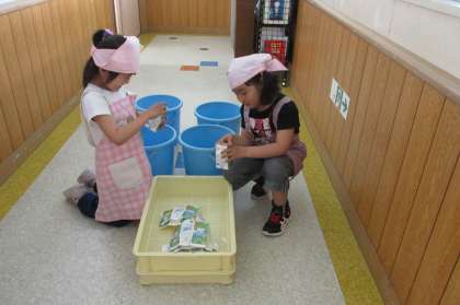 5/08 そろそろ1年生も給食の準備や後片付けを自分達だけの力でやり始める時期となりました。