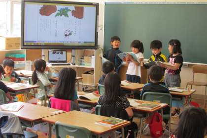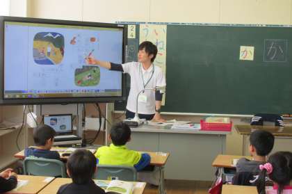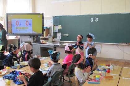 5/08 1年生の電子黒板活用の様子です。デジタルタイマーで食事時間を知らせたり、デジタル教科書を活用したりしています。