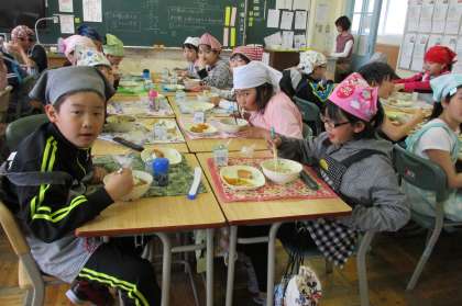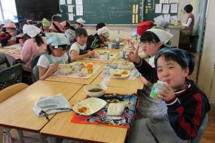 5/10 今日の給食です。今日のメニューは、かしわうどん、いなりずし、白菜のおひたしでした。食事の様子は、4年2組です。