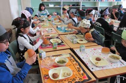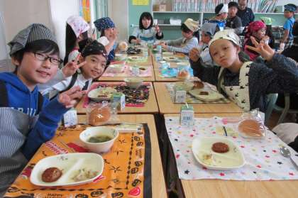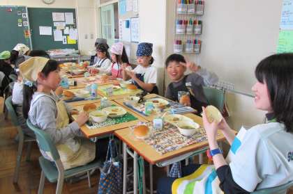 5/11 今日の給食です。今日のメニューは、バンズパン、春雨スープ、ハンバーグケチャップソース、ジャーマンポテト、スライスチーズでした。申し訳ありませんが本日の給食物撮りデータを消してしまったため、5年1組の食事の様子のみでご容赦ください。