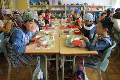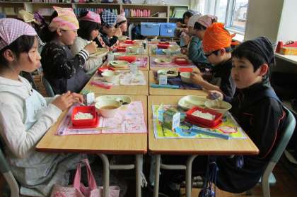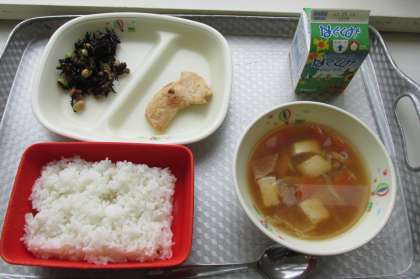 5/12 今日の給食です。今日のメニューは、ご飯、よしの汁、鶏肉のみそ焼き、大豆の煮物でした。意外にも子ども達はひじきの煮物(大豆の煮物)が大好きです。食事の様子は5年2組です。