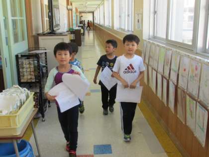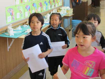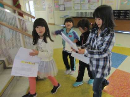 5/17 5時間目に2年生が《1年生をむかえよう》と、1年生をつれて、学校の中を案内して歩きました。今日は1年3組の子を案内しました。明日は1年2組、明後日は1年1組の子を案内します。